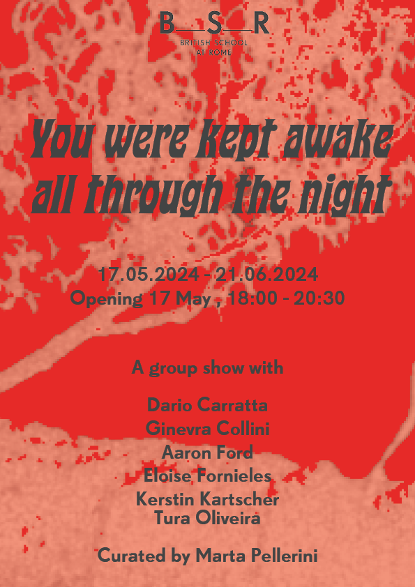 La mostra collettiva “You were kept awake all through the night” con gli artisti Dario Carratta, Ginevra Collini, Aaron Ford, Eloise Fornieles, Kerstin Kartscher, Tura Oliveira e curata da Marta Pellerini si terrà dal 17 maggio al 21 giugno 2024 presso la British School at Roma. L’inaugurazione della mostra avrà luogo il 17 maggio dalle 18:00 alle 20:30.