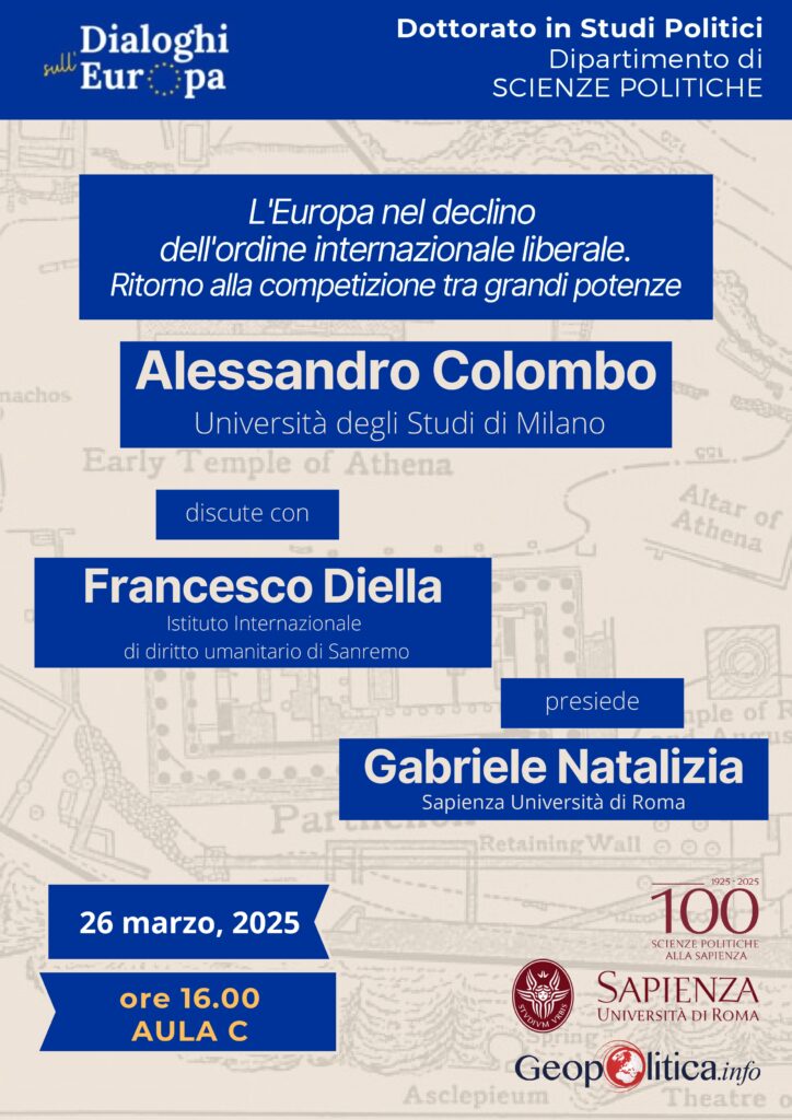 “L’Europa nel declino dell’ordine internazionale liberale. Ritorno alla competizione tra grandi potenze” – Incontro con i proff. Alessandro Colombo (Univ. Milano “La Statale”) e Gabriele Natalizia (Sapienza Univ. Roma) e Francesco Diella (istiuto internazionale di diritto umanitario di Sanremo)