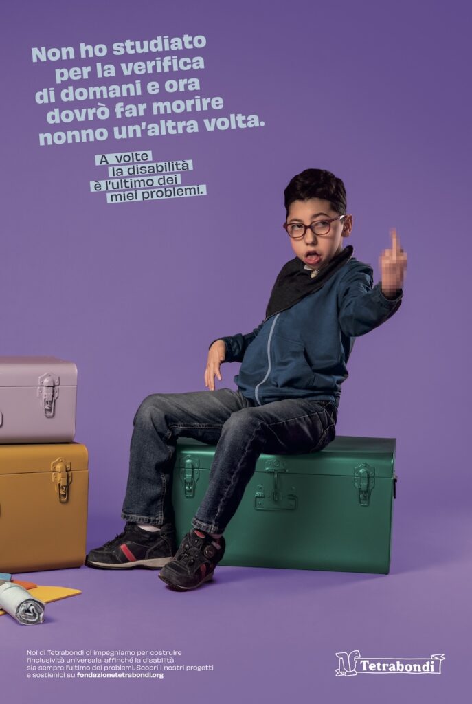 Fuori dagli stereotipi dei “bambini speciali”, una campagna originale, forte, anche eccessiva sceglie di dar voce a chi voce non ha con la giusta dose di ironia e irriverenza. Sirio, Gaia, Mara, Oly e Theo – storti, sbilenchi, sordi, ipovedenti – sono solo un piccolo pezzettino di un esercito sgangherato e irriverente di corpi e menti non conformi che vuole riappropriarsi del diritto di raccontarsi per quello che è, al di là della disabilità. La campagna dei Tetrabondi parla della quotidianità “normale” di queste ragazze e ragazzi attraverso video e spot radio a cui dà voce Valerio Mastrandrea, e con le foto di Ilaria Magliocchetti Lombi. E’ stata ideata e realizzata gratuitamente dall’agenzia SuperHumans.